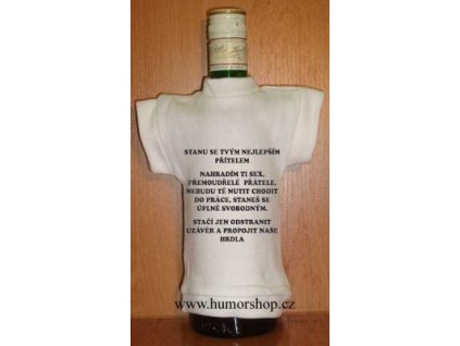 Kupte oslavenci lahev alkoholu, který má nejradši, na ni navlečte tohle tričko, nechte se pochválit za dobrý vkus a nápad a hurá do víru oslav! Vtipné tričko sluší každé láhvi.