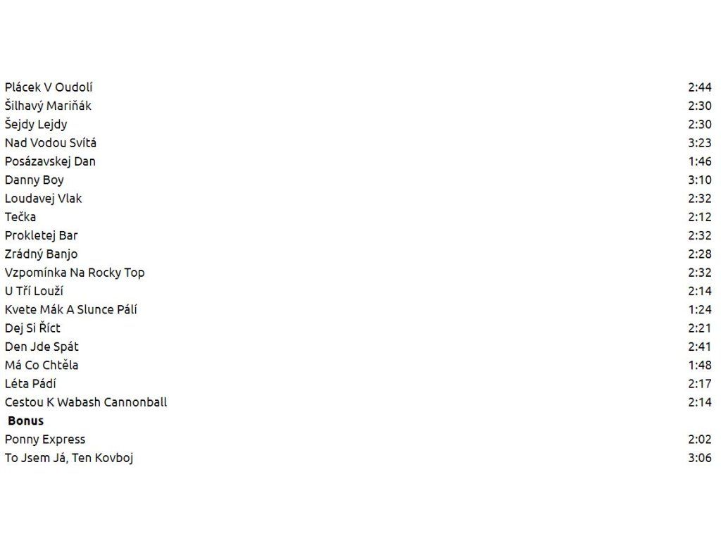CD K.T.O. - Best of + 2 CD K.T.O. - Best of (Universal 2002) - výborný stav !! Plácek V Oudolí 2:44 Šilhavý Mariňák 2:30 Šejdy Lejdy 2:30 Nad Vodou Svítá 3:23 Posázavskej Dan 1:46 Danny Boy 3:10 Loudavej Vlak 2:32 Tečka 2:12 Prokletej Bar 2:32 Zrádný Banjo 2:28 Vzpomínka Na Rocky Top 2:32 U Tří Louží 2:14 Kvete Mák A Slunce Pálí 1:24 Dej Si Říct 2:21 Den Jde Spát 2:41 Má Co Chtěla 1:48 Léta Pádí 2:17 Cestou K Wabash Cannonball 2:14 Bonus Ponny Express 2:02 To Jsem Já, Ten Kovboj 3:06