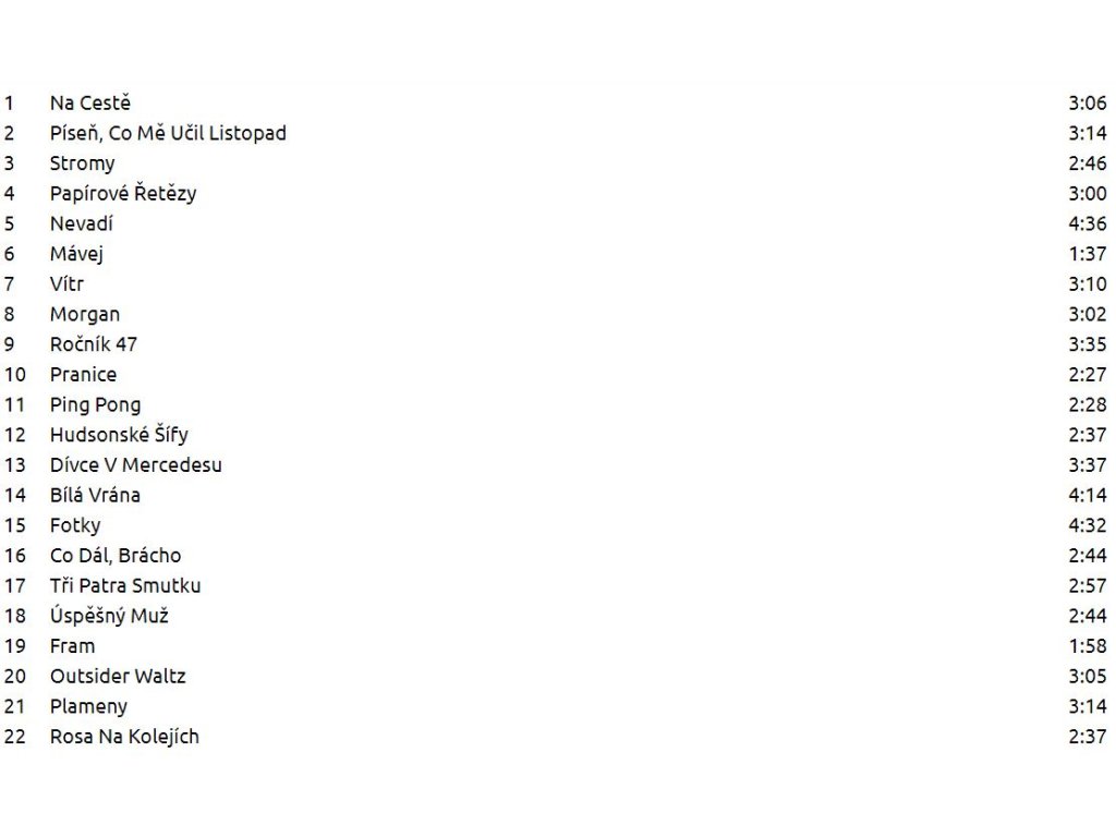 CD Wabi Daněk (1990), 1 Na Cestě 3:06 2 Píseň, Co Mě Učil Listopad 3:14 3 Stromy 2:46 4 Papírové Řetězy 3:00 5 Nevadí 4:36 6 Mávej 1:37 7 Vítr 3:10 8 Morgan 3:02 9 Ročník 47 3:35 10 Pranice 2:27 11 Ping Pong 2:28 12 Hudsonské Šífy 2:37 13 Dívce V Mercedesu 3:37 14 Bílá Vrána 4:14 15 Fotky 4:32 16 Co Dál, Brácho 2:44 17 Tři Patra Smutku 2:57 18 Úspěšný Muž 2:44 19 Fram 1:58 20 Outsider Waltz 3:05 21 Plameny 3:14 22 Rosa Na Kolejích 2:37