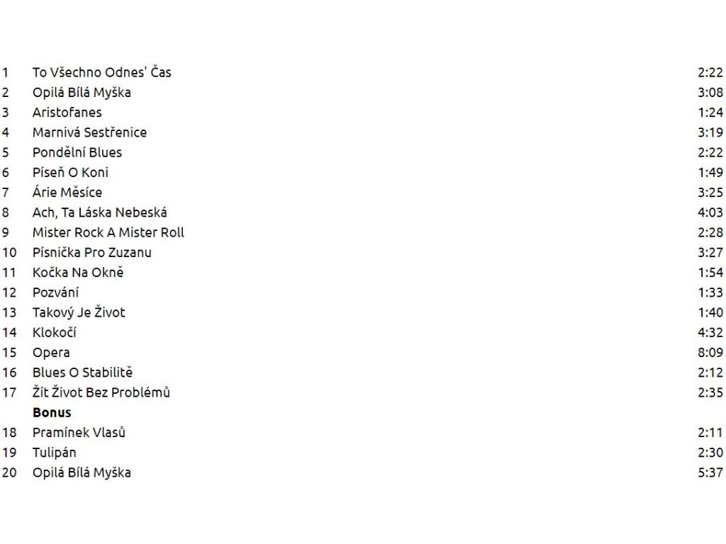 CD Waldemar Matuška - To všechno odnes' čas + 6 (Bonton 1998) - nová !! 1 To Všechno Odnes' Čas 2:22 2 Opilá Bílá Myška 3:08 3 Aristofanes 1:24 4 Marnivá Sestřenice 3:19 5 Pondělní Blues 2:22 6 Píseň O Koni 1:49 7 Árie Měsíce 3:25 8 Ach, Ta Láska Nebeská 4:03 9 Mister Rock A Mister Roll 2:28 10 Písnička Pro Zuzanu 3:27 11 Kočka Na Okně 1:54 12 Pozvání 1:33 13 Takový Je Život 1:40 14 Klokočí 4:32 15 Opera 8:09 16 Blues O Stabilitě 2:12 17 Žít Život Bez Problémů 2:35 Bonus 18 Pramínek Vlasů 2:11 19 Tulipán 2:30 20 Opilá Bílá Myška 5:37