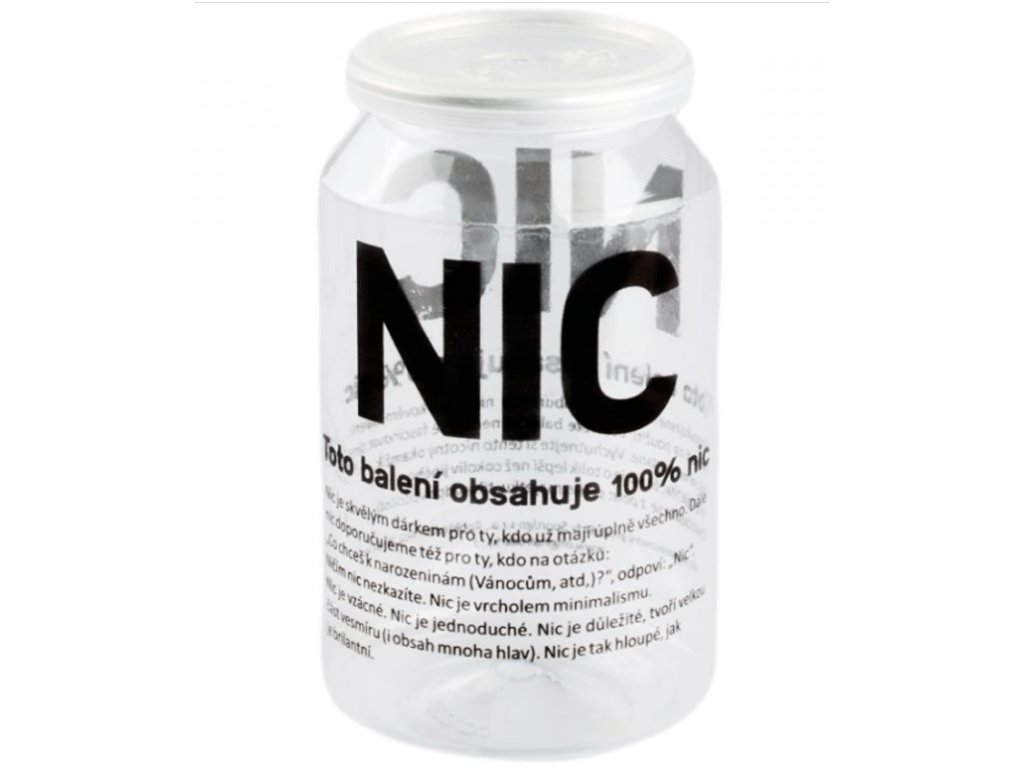 Vtipný dárek pro případ, kdy se ptáte oslavence: "Co bys chtěl k narozeninám?" A on řekne: "Nic." Díky této legrácce máte splněno. Jde o plastovou průhlednou plechovku vysokou 11,5 cm o průměru cca 7 cm, na níž je napsáno: "NIC. Toto balení obsahuje 100% nic. Gratulujeme! Právě jste obdržel/a nic v dárkovém balení. Návod na použití: otevřete balení a nechte se fascinovat tím, jak se nic nestane. Vychutnejte si tento nicotný okamžik. Brzy zjistíte, že nic je o tolik lepší než cokoliv jiného.